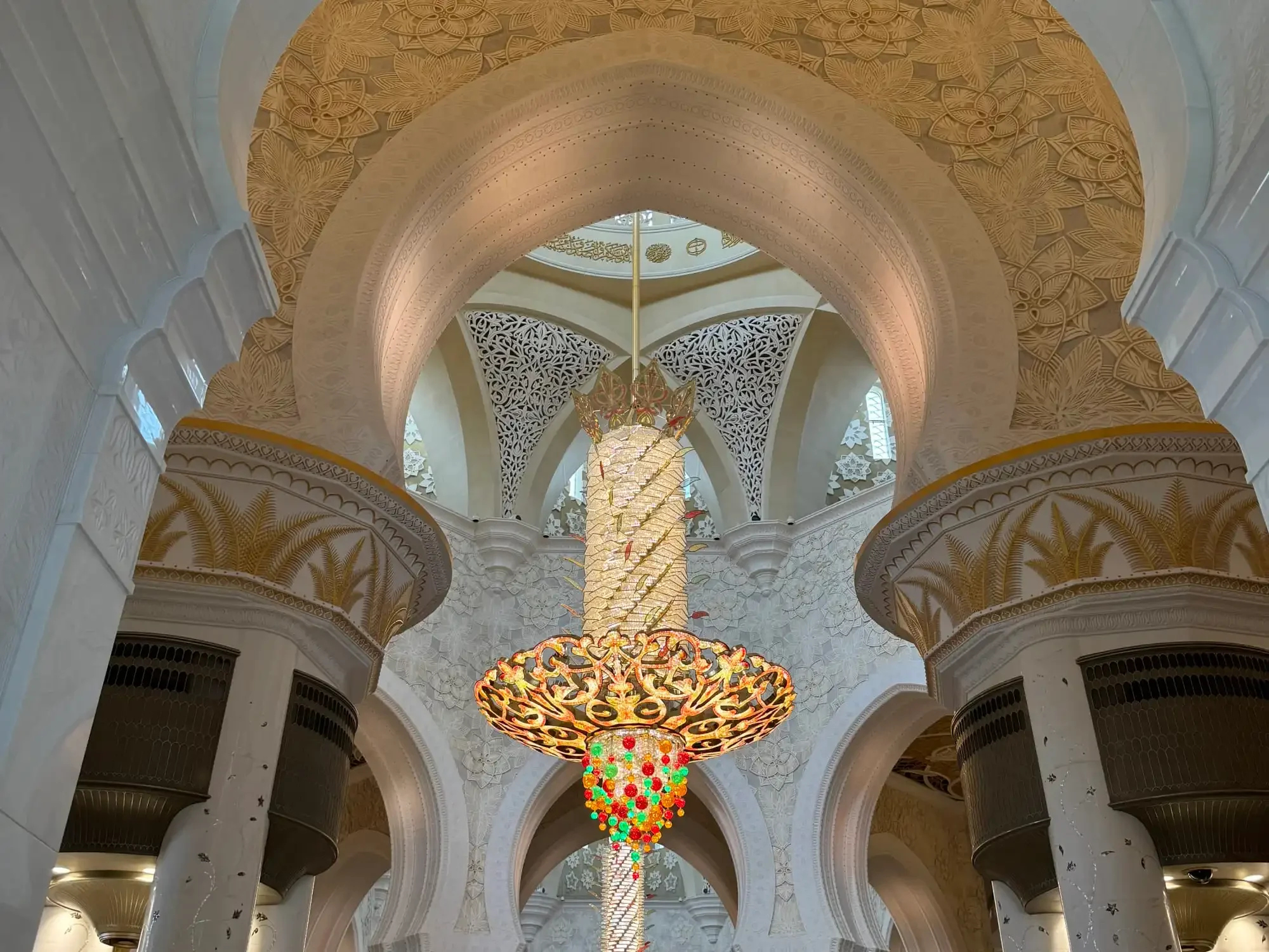 On day two, we traveled with Level Up via private transfer for 1.5 hours from Dubai to Abu Dhabi, dressed in abayas, covered from neck to wrists to ankles and ready for our visit to the Sheikh Zayed Grand Mosque. This modern architectural masterpiece was completed in 2007. It left us in awe of its serene white domes, reflective pools, intricate floral mosaics and the world's largest chandeliers. Beyond its breathtaking beauty, the mosque embodies unity and deep faith — a space where we wished we could linger longer to soak in its peaceful energy.